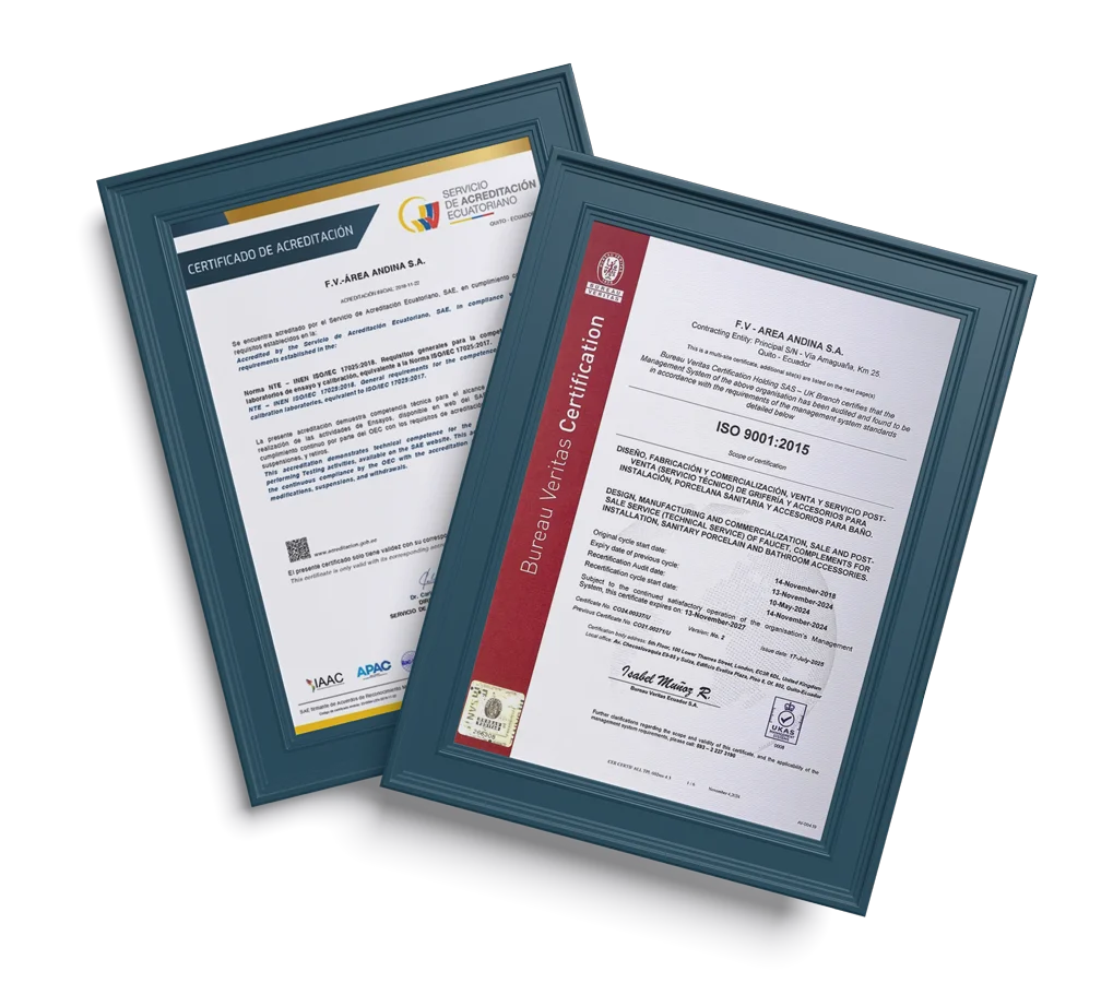 Además FV cuenta con el primer laboratorio de ensayos y control de calidad de sanitarios y grifería acreditado por el Servicio de Acreditación Ecuatoriano (SAE) en cumplimiento de los requisitos establecidos en la Norma NTE–INEN ISO/IEC 17025:2018 “Requisitos generales para la competencia de los laboratorios de ensayo y calibración” Acreditación No. SAE LEN 18-038.