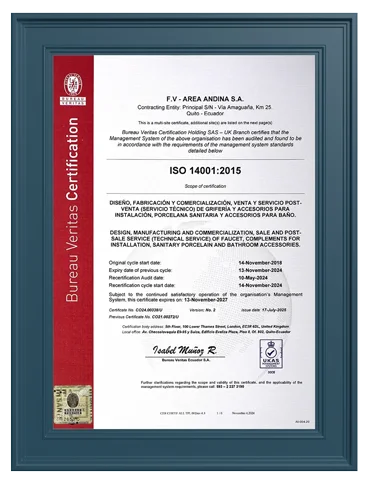 En FV, la calidad, el medio ambiente y la seguridad son una cultura, por eso certificamos nuestros Sistemas de Gestión bajo las normas internacionales ISO 9001:2015 e ISO 14001:2015. Estos certificados, se otorgan bajo condiciones contractuales que implican periódicamente auditorías externas a nuestro Sistema de Gestión de la Calidad y Sistema de Gestión Ambiental, abarcando el diseño, fabricación y comercialización, venta y servicio post-venta (servicio técnico) de grifería, complementos para instalación, porcelana sanitaria y accesorios para baño.