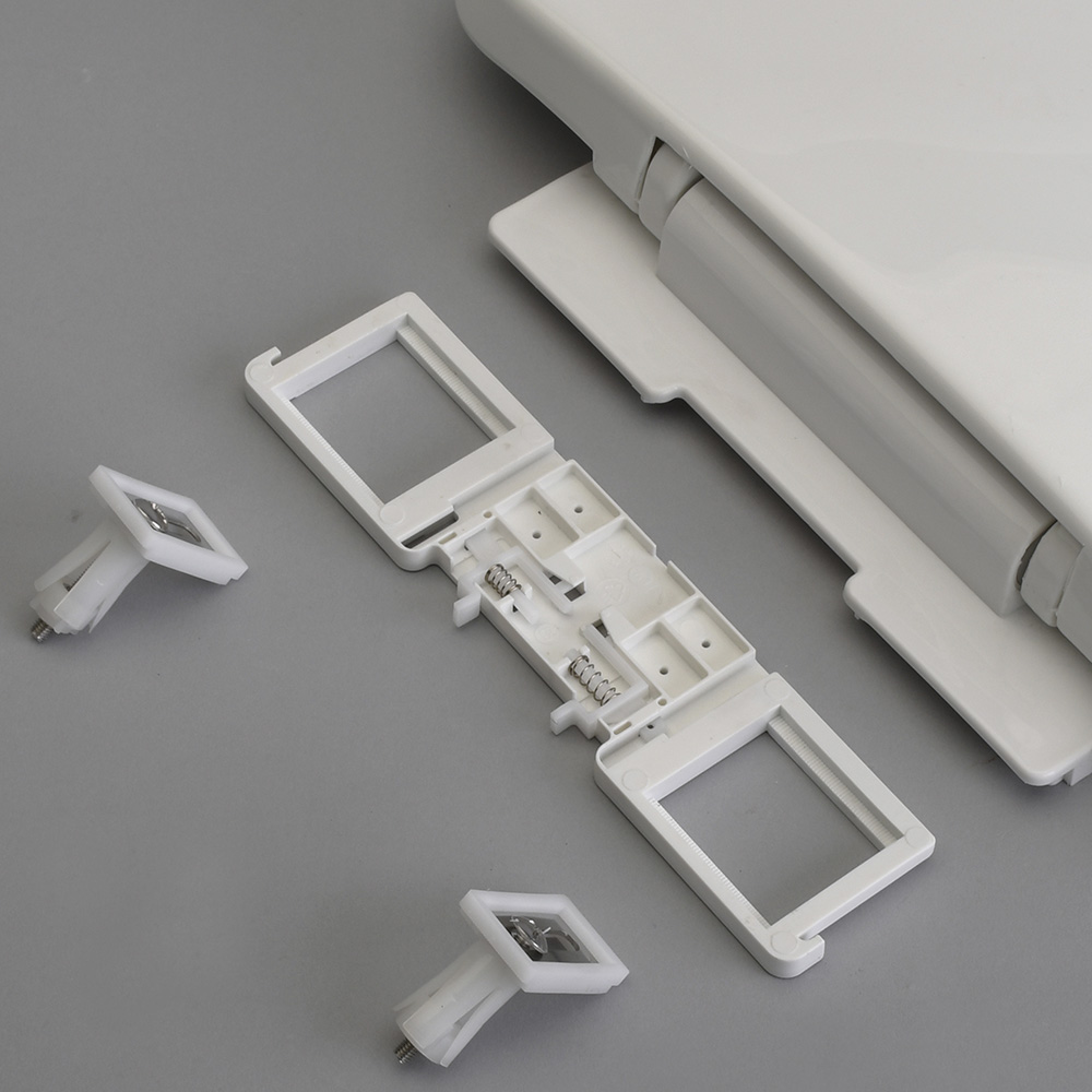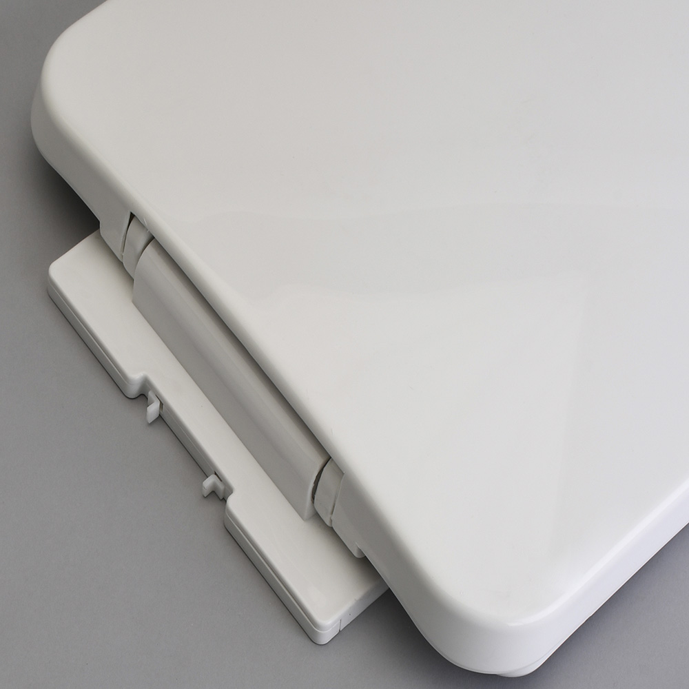 Asiento para inodoro con cierre suave y fijación regulable; material resistente y fácil limpieza.