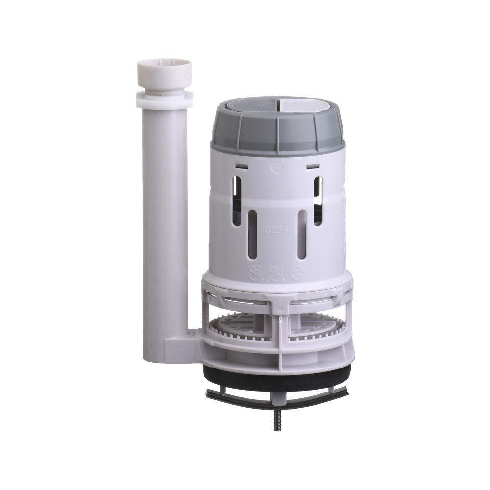 Válvula para inodoro de doble descarga que ahorra agua y asegura cierre confiable; construcción resistente.