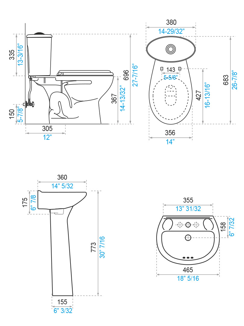Las medidas de los productos de porcelana sanitaria se encuentran en milímetros y pulgadas y pueden variar entre un 3% a 5%. |