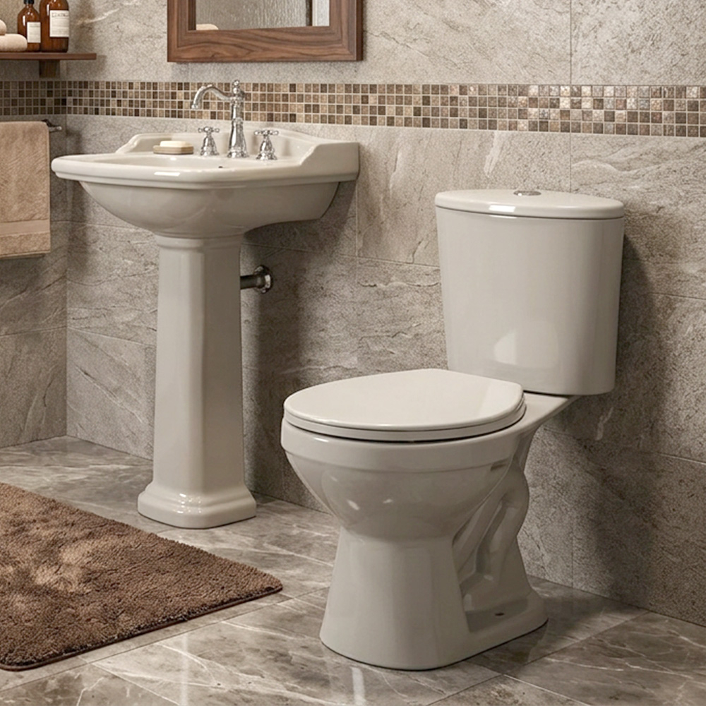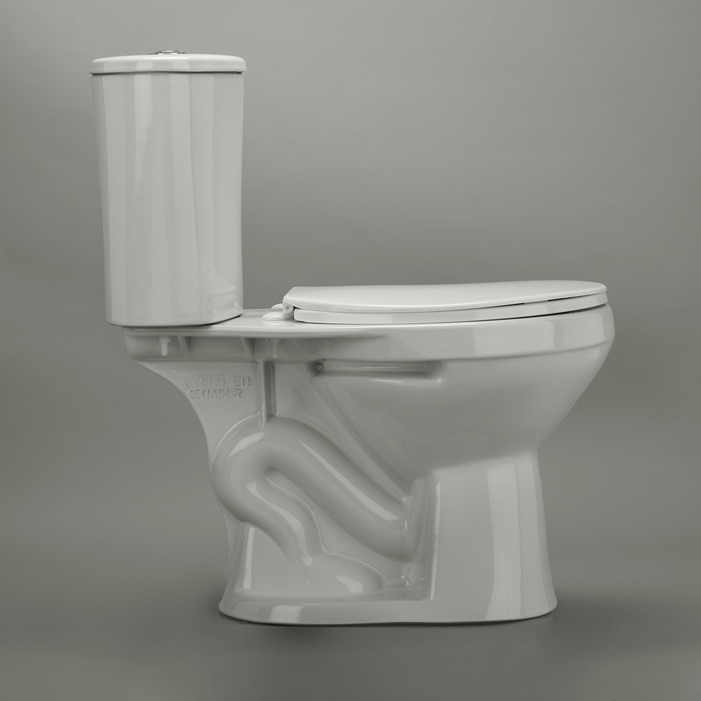 Inodoro con descarga eficiente, cerámica de alta resistencia y diseño confortable; equilibrio entre higiene y durabilidad.
