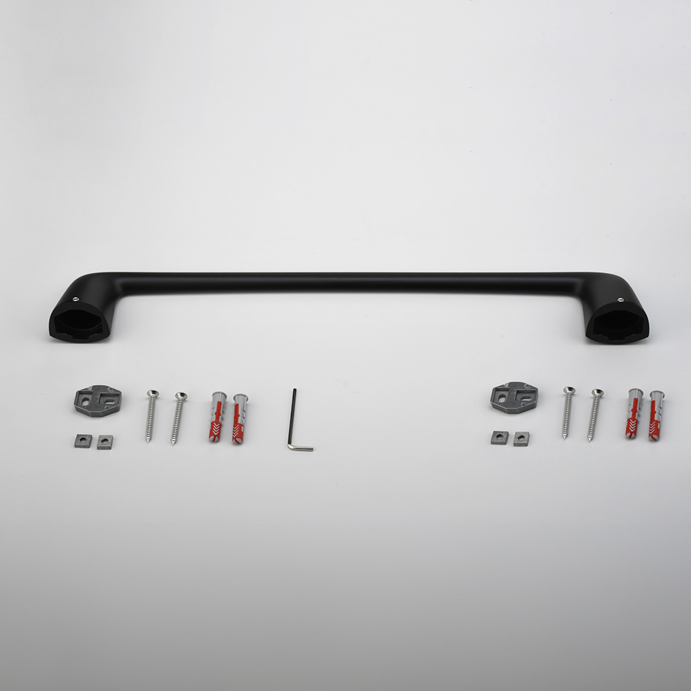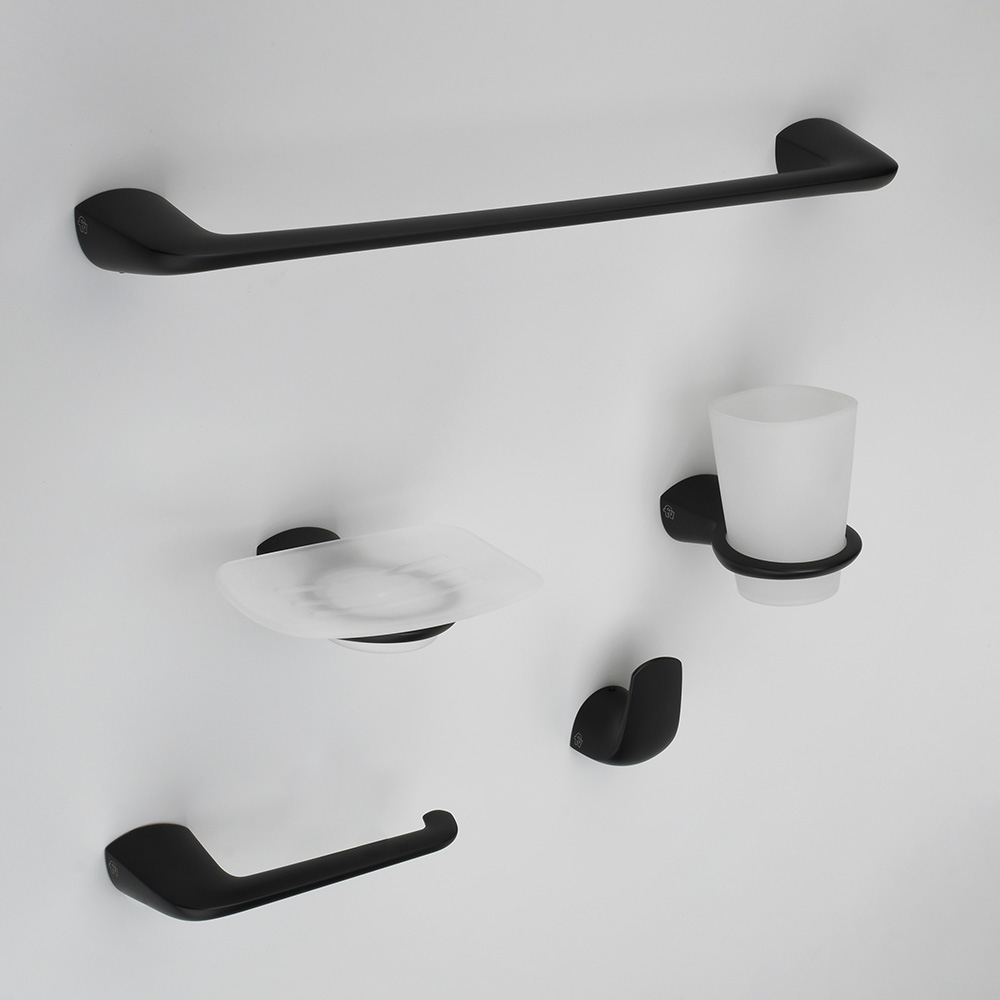 Este juego completo de accesorios Epuyén de acabado negro, ofrece resistencia y durabilidad con materiales de latón y acero inoxidable, ideal para organizar y optimizar el baño con calidad profesional.