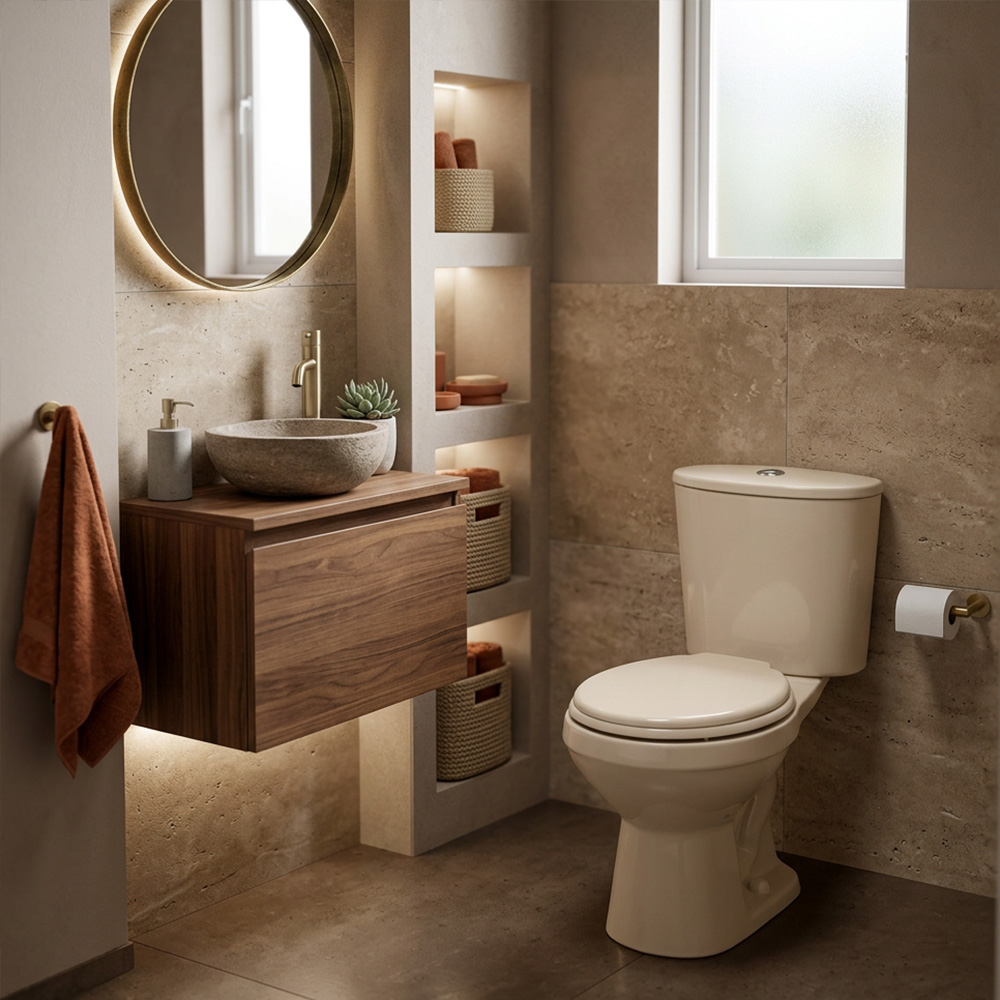 Inodoro con descarga eficiente, cerámica de alta resistencia y diseño confortable; equilibrio entre higiene y durabilidad.