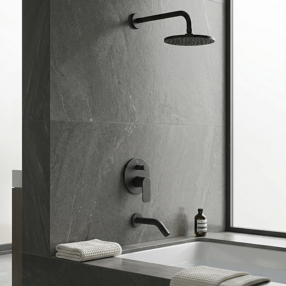 Juego de ducha y pico para tina con operación suave y precisa y acabado resistente; diseño moderno, elegante y minimalista.