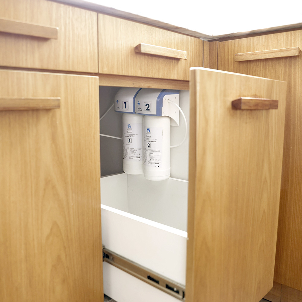 - Se recomienda instalar en la parte baja del fregadero de la cocina, para poder realizar una instalación adecuada con la grifería que dispensará el agua tratada.