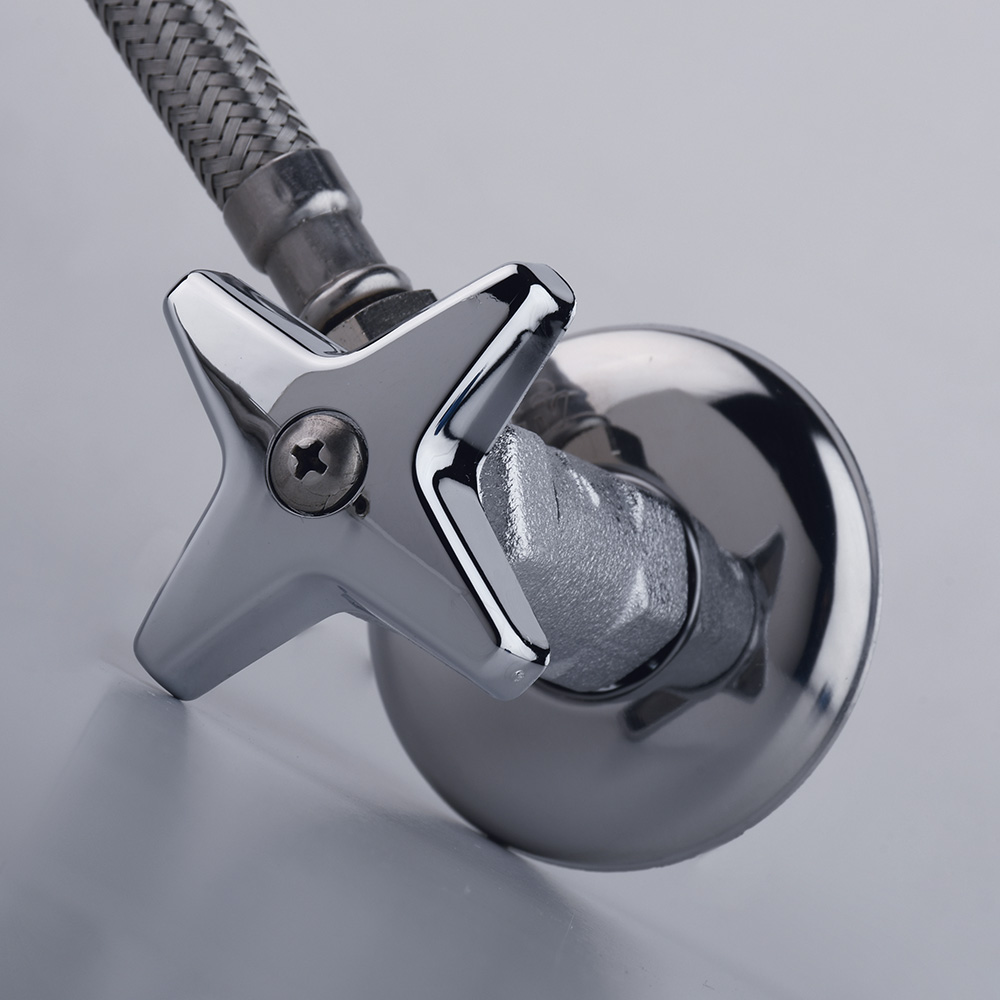 Llave angular metálica con manguera flexible de 16" para lavabo, diseñada para ofrecer durabilidad y funcionalidad en baños. Su construcción robusta garantiza un rendimiento confiable y una instalación sencilla.
