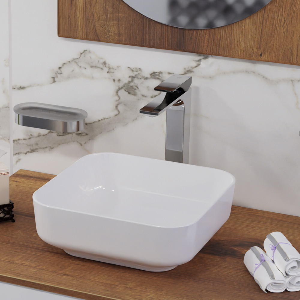 Juego monocomando alto para lavabos Vessel EDNA de diseño moderno y elegante. Fabricado con materiales de alta calidad, ofrece un control preciso del flujo de agua. Ideal para baños contemporáneos, combina estilo y funcionalidad.