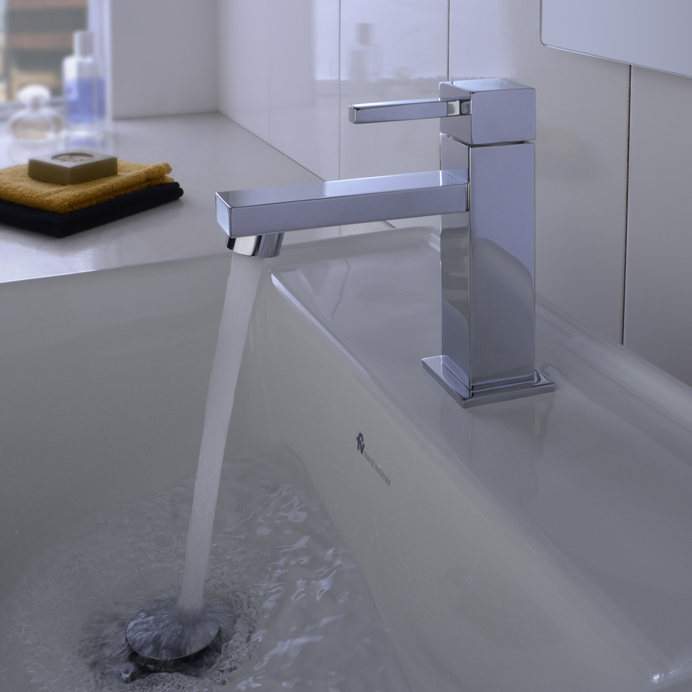 Llave para lavabo de diseño moderno y elegante, la Llave Plus para Lavabo DOMINIC de FV destaca por su acabado cromado y sistema de control preciso. Fabricada con materiales de alta resistencia, garantiza durabilidad y un flujo de agua eficiente. Ideal para baños contemporáneos.