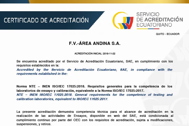 La empresa FV - Área Andina S.A. fue certificada por el Servicio de Acreditación Ecuatoriano (SAE) como Primer Laboratorio de Ensayos de Control de Calidad de Sanitarios y Grifería del país. Luego de una minuciosa evaluación, el SAE, mediante la Resolución No. SAE-ACR-0290-2018, otorgó la acreditación al Laboratorio FV - Área Andina S.A.